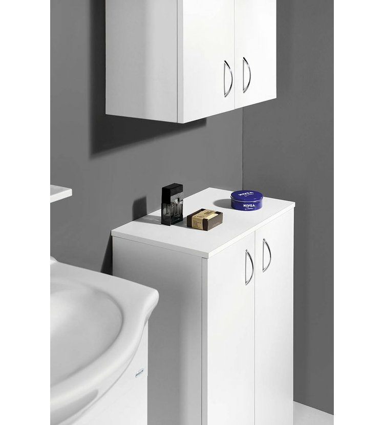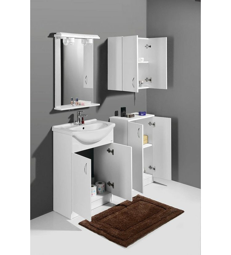 Koupelnový nábytek z bílého lamina, nejjednodušší řešení pro Vaši koupelnu. Nabídka umyvadlových skříněk ve 4 rozměrech v šířkách od 50 cm do 65 cm v kombinaci s několika variantami doplňkových skříněk nabízí příznivé uspořádání nábytku téměř do každé koupelny za nejlepší cenu.