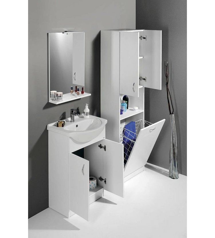 Koupelnový nábytek z bílého lamina, nejjednodušší řešení pro Vaši koupelnu. Nabídka umyvadlových skříněk ve 4 rozměrech v šířkách od 50 cm do 65 cm v kombinaci s několika variantami doplňkových skříněk nabízí příznivé uspořádání nábytku téměř do každé koupelny za nejlepší cenu.